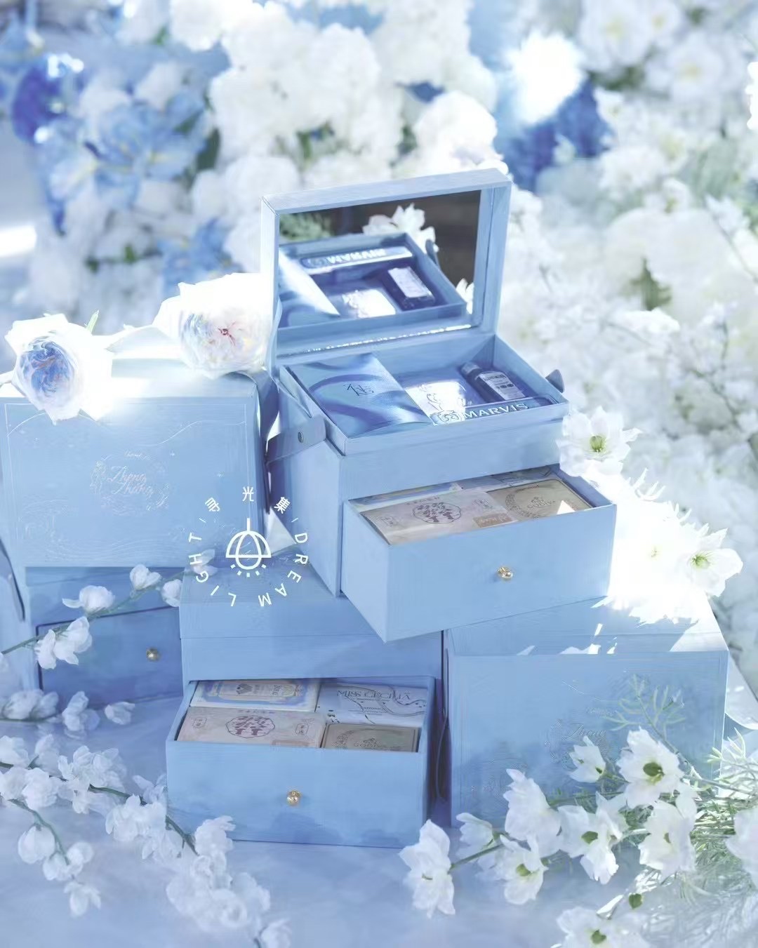 寻光集DREAM LIGIT是由中国美术学院团队打造的高定礼品设计机构。以“创意点亮生活” 为理念,致力 于创意礼品设计,为新人定制LOG0、礼盒、桌糖等相关婚品:并为企业提供VI设计、包装设计、创意礼盒定制服务。